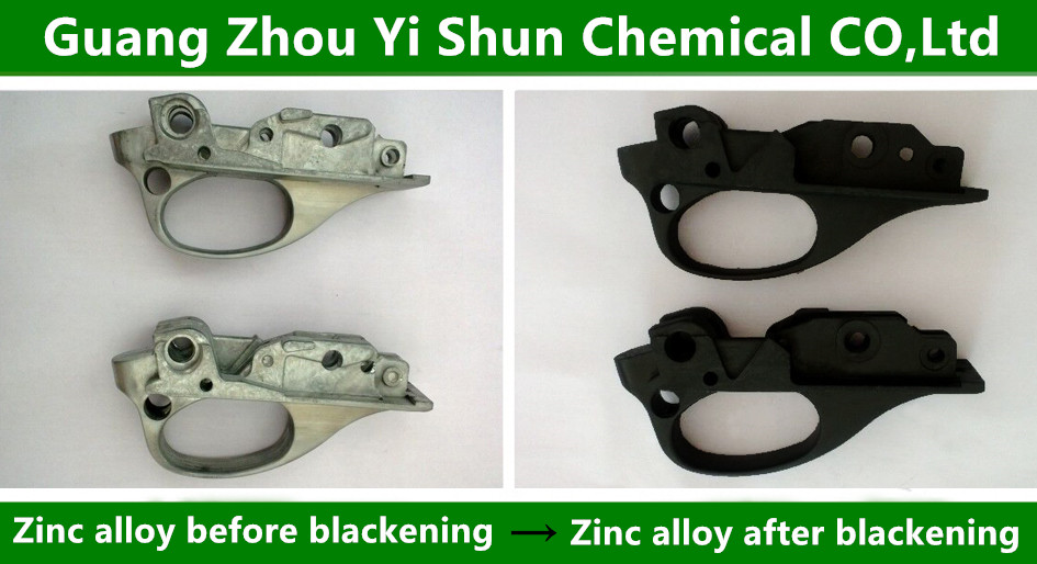 Zinc blackening agent,Zinc alloy blackening agent,Zinc black passivating agent,Black zinc passivating agent Zinc blackening agent,Zinc alloy blackening agent,Zinc black passivating agent,Black zinc passivating agent First, the product code: Q / YS.504 (Yi Shun brand) Second, product advantages: The product is free of trivalent chromium and hexavalent chromium. The zinc passivation film is dense and shiny, more corrosion resistant than traditional hexavalent chromium. It is stable in use, simple in operation and clean in working environment. Near-neutral products, the skin is almost no stimulation, non-toxic environmental protection, corrosion-resistant film with strong binding, neutral salt spray test 300 hours or more. Third, the product scope: Widely used in zinc plating and zinc alloy passivation, passivation film was bright black, suitable for hanging plating, barrel plating, screws, auto parts and other motorcycle the most urgent designated project. Fourth, product index: Product appearance: ① colorless, tasteless, transparent liquid ② proportion: 1.02 ~ 1.03 ③ PH value: 5.0 ~ 6.0 (partial neutral) Five, use method: ① After adding 1 times tap water into the working fluid. ② The working fluid heated to 80 ℃ ~ 90 ℃, you can use. ③ The galvanized workpiece immersed in 3% nitric acid for 3 seconds, the workpiece light. (The best use of the company dedicated light agent, does not hurt the zinc layer) ④Immediately after washing the galvanized parts into the environmental protection chromium-free black zinc passivation agent for 3-5 minutes, the passivation film was shiny black. ⑤ Closed film: immersed in blocking agent for 2 minutes and then washed. ⑥ Wash the workpiece after drying clean, 50 ℃ drying half an hour. Other processing:、Environmental degreer and rust remover、Copper colored chocolate、Electroless plating of real gold on copper surface、Strong oil stain removal agent、Copper、chromium and nickel stripping agent、Metal coloring agent、The copper surface is chemically coated with black metal film、Copper colored chocolate
