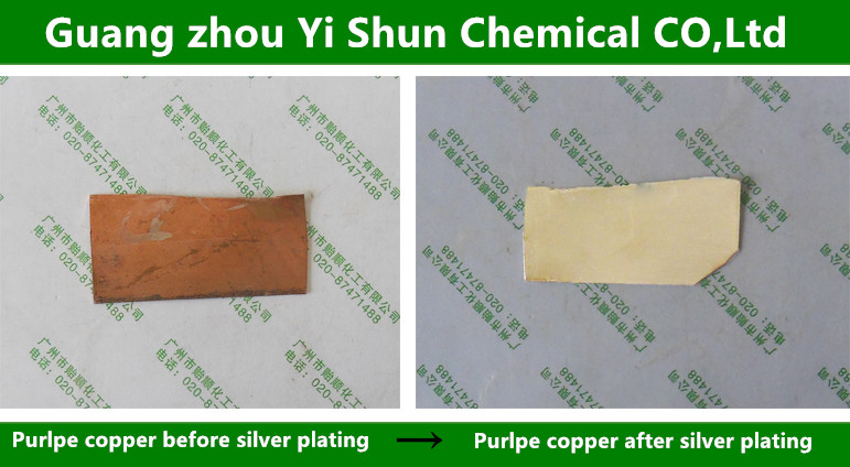 Electroless silver plating on copper surface,Silver water on chemical copper,Copper Surface environmental Protection Silver Electroless silver plating on copper surface,Silver water on chemical copper,Copper Surface environmental Protection Silver First, the product code: Q / YS.801-3 (Yi Shun brand) Second, the scope of products: This product is suitable for all kinds of copper alloy (brass, copper) surface chemical plating matte silver, silver plating layer is white, not yellow, will not turn black can be used for the electronic industry and copper alloy surface purple silver, the product environmental protection. Third, product index: ① product is light yellow transparent liquid, odorless. ② proportion:> 1.0 ③ PH value:> 7.0 Fourth, the use of methods: ① This product is used stock solution.The copper surface degreasing and polishing ,washing, get bright copper surface. ② The matte silver liquid is heated to 50 ~ 60 ℃ (with plastic or glassware ), the pieces of copper immersed in 50 ~ 60 ℃ silver plated liquid, 1 to 3 minutes later, after taking the copper parts, washed. ③ Passivation silver plating layer, washing, drying. Other processing:Chemical Plating Liquid Train、Environmental degreer and rust remover、Stainless Steel Polishing Agentas、Brass Green Chemical polishing Agent、Electroless plating of real gold on copper surface、Strong oil stain removal agent、Chemical nickel plating liquid(copper/iron/lead substrate)