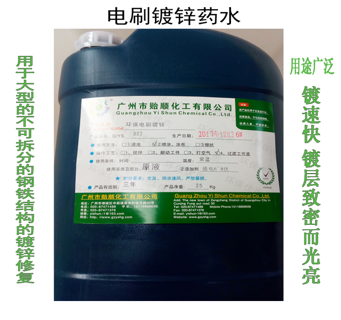 環(huán)保電刷鍍鋅 (一) 產(chǎn)品編號(hào):Q/YS.522 電刷鍍鋅藥水 鋼鐵表面刷鍍鋅 電刷鍍鋅光亮劑 (二)功能與用途: 本產(chǎn)品是環(huán)保產(chǎn)品,不含一切重金屬及受控物質(zhì),用于鋼鐵表面刷鍍鋅,刷鍍簡(jiǎn)單,用于各種鍍鋅件的修補(bǔ)及大型鋼鐵結(jié)構(gòu)鍍鋅保護(hù),更適用于大型的不可拆分的鋼鐵結(jié)構(gòu)的鍍鋅修復(fù)。本產(chǎn)品用途十分廣泛,鍍速快,鍍層致密而光亮。 (三)產(chǎn)品指標(biāo):1.本產(chǎn)品為透明無異味的液體 2.比重>1.0 3.PH值=8.0±0.5 (四)使用方法: 1.將本品原液常溫使用。 2.工件條件:電壓 6-16伏,刷鍍的線速率為4-10米/分鐘。 3.可以反復(fù)刷鍍,增加鋅層的厚度。 4.陽極鍍刷可采用不銹鋼或者石墨材質(zhì)。 其他處理環(huán)保仿金電鍍、電刷鍍錫液、鍍鋅板仿金、其他化學(xué)鍍液等等